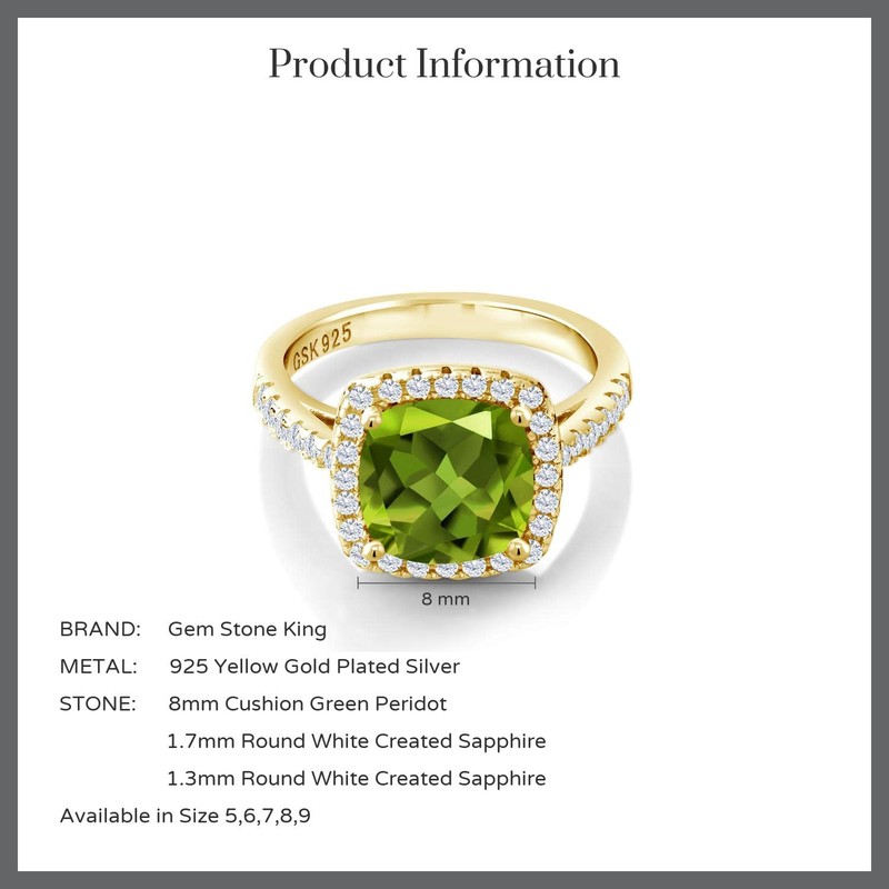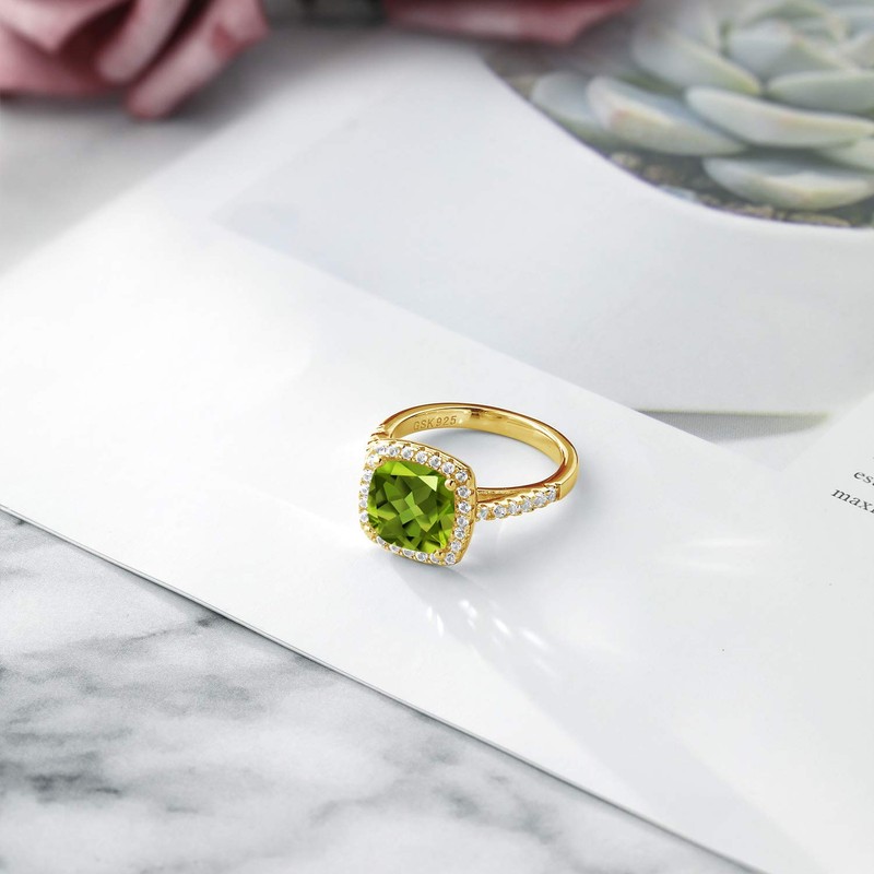 Gem Stone King 2.95 Cttw Green Peridot and White Created Sapphire 18K Yellow Gold Plated Silver Ring For Women | Gemstone Birthstone | 8MM Cushion | Available In Size 5, 6, 7, 8, 9