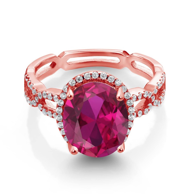 Gem Stone King 4.55 Cttw 18K Rose Gold Plated Silver Red Created Ruby and White Created Sapphire Ring For Women | Oval 11X9MM | Available In Size 5, 6, 7, 8, 9