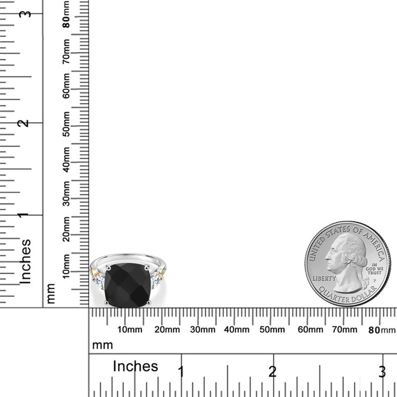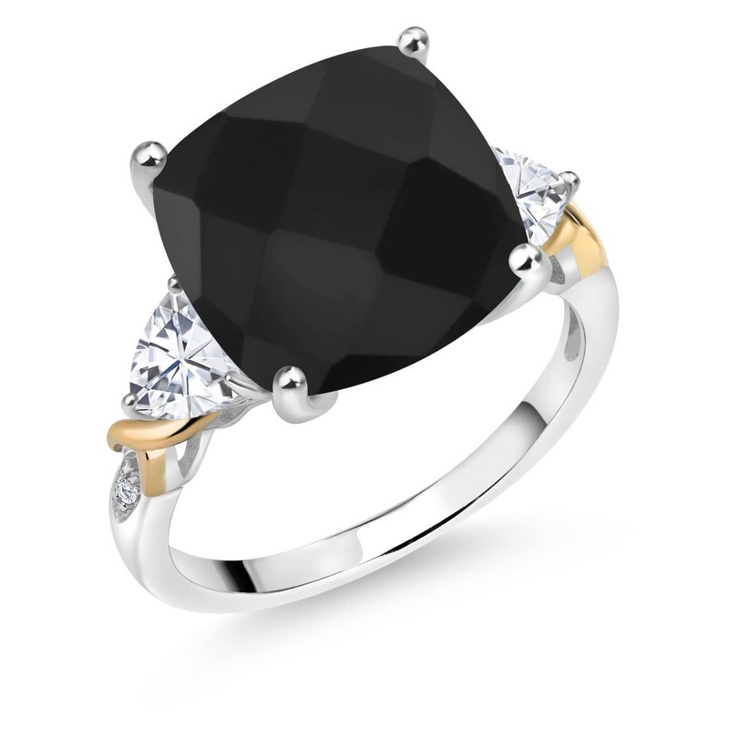 Gem Stone King 925 Silver and 10K Yellow Black Onyx White Moissanite and Diamond Ring For Women (6.45 Cttw, 12MM Cushion and 5MM Trillion, Gemstone Birthstone, Available in Size 5,6,7,8,9)