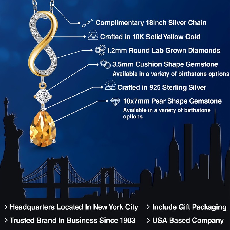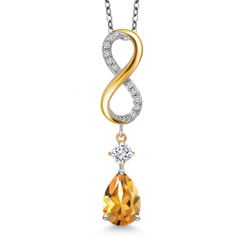 925 Silver and 10K Yellow Gold Yellow Citrine and White Moissanite and Lab Grown Diamond Pendant Necklace for Women | 1.96 Cttw | Gemstone November Birthstone | Pear Shape 10X7MM | With 18 Inch Chain