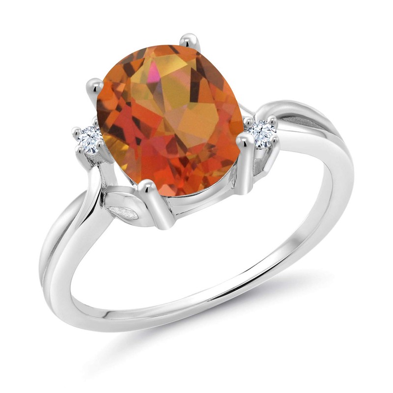 - Radiant 3-Stone Design – Features a bold 10X8MM oval-cut twilight orange mystic quartz flanked by two white created sapphires, delivering 2.73 Cttw of vivid color, brilliance, and elegant symmetry.