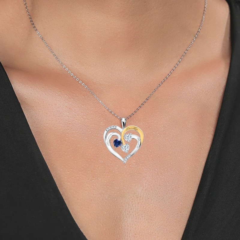 Two Tone Blue Created Sapphire and White Moissanite `Forever In My Heart` Engraved Pendant Necklace For Women (1.34 cttw, Heart Shape 5MM, 18 Inch Chain)