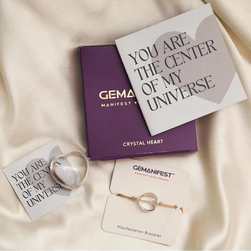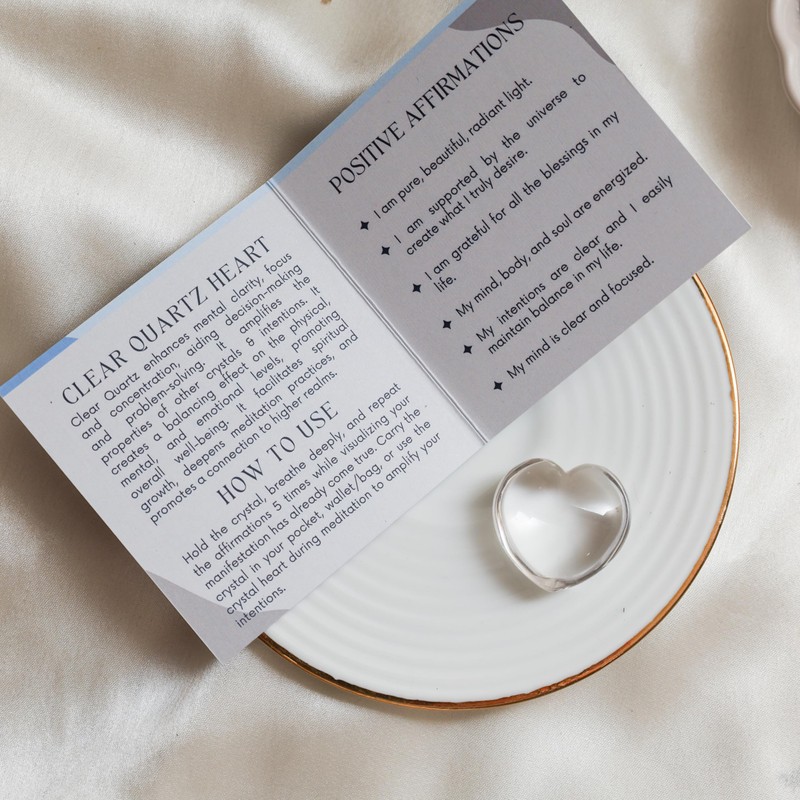 - READY-TO-GIFT SET Our package includes a 15 mm Clear Quartz Heart Bracelet, 30 mm Clear Quartz Heart Crystal, a Sentiment Message Card with Affirmations, and Basic Information about Clear Quartz, all beautifully packaged in a ready-to-gift box.