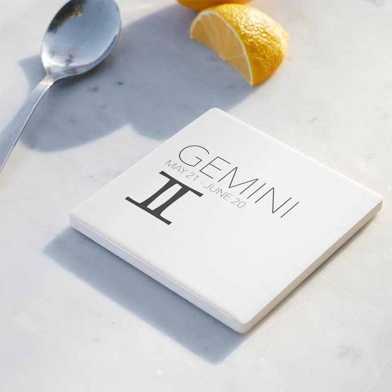 Gemini Zodiac, Joyride Home Decor, Single Ceramic Coaster, 4-inch Individual Square Drink Coaster, Non-Slip Cork Back, Protects Surfaces, Express Your Style.