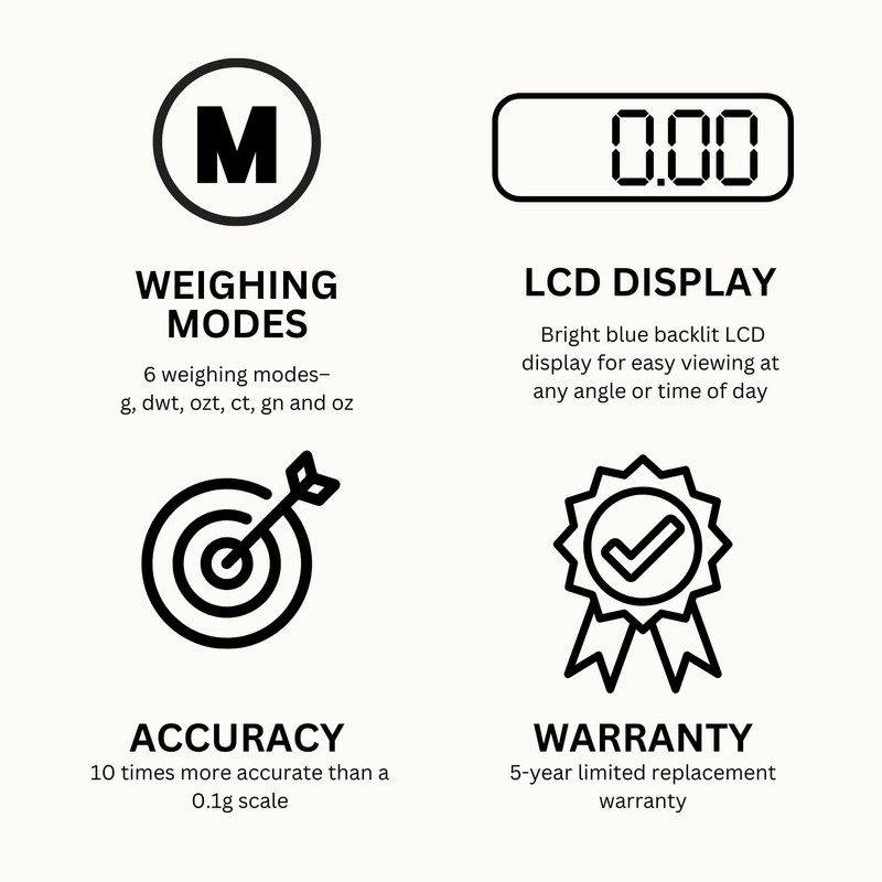 - AUTO SHUT-OFF: To preserve battery life, the scale is equipped with an auto-shut-off feature. If left idle for a specific period, it will automatically power off, saving energy and extending the battery's lifespan. The GemOro Platinum Scale also provides push-button digital calibration to maintain accuracy over time. Calibration ensures consistent and reliable measurements, maintaining the scale's performance. This product comes with a 5-year limited replacement warranty.
