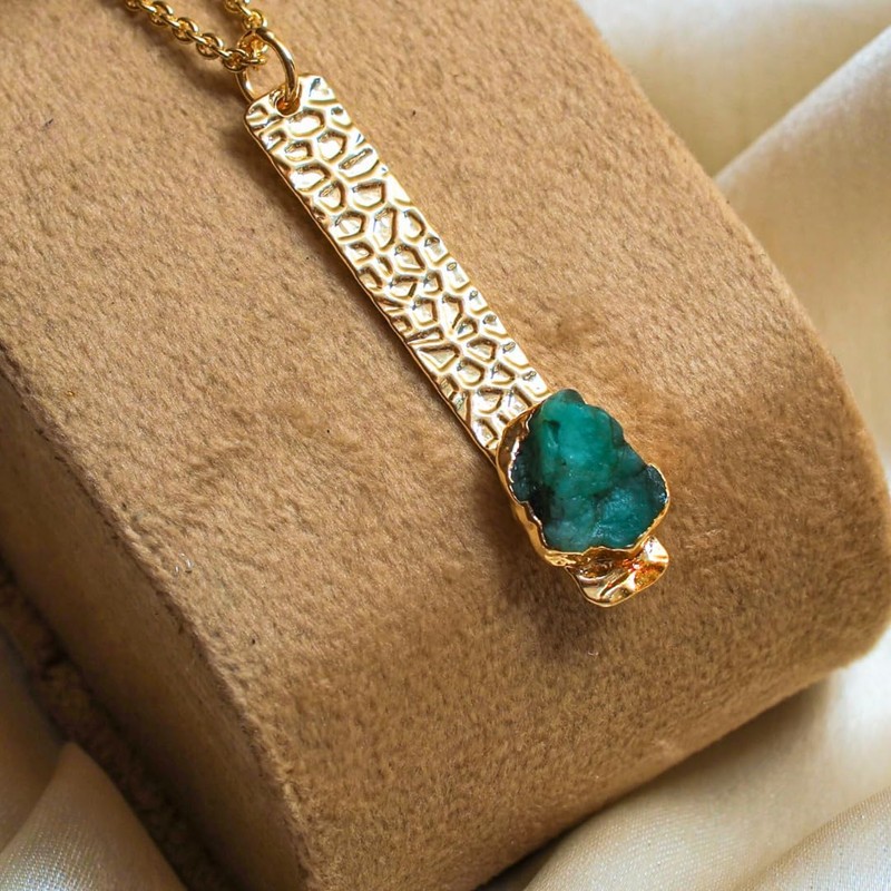 This handmade necklace features a raw emerald gemstone — electro-set on a hammered vertical gold bar. Known for its connection to the heart chakra and energy of growth and compassion, emerald is both meaningful and timeless.