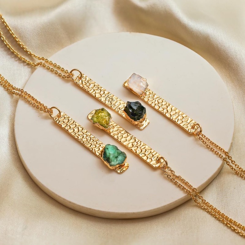 Each 4–7 mm stone is one of a kind, offering vibrant green hues in a natural texture. The 40x8 mm gold-plated bar pendant is paired with a 16+2 inch adjustable anchor chain, making it easy to layer or wear solo. Hypoallergenic and nickel-free, it’s crafted for comfort and intention.