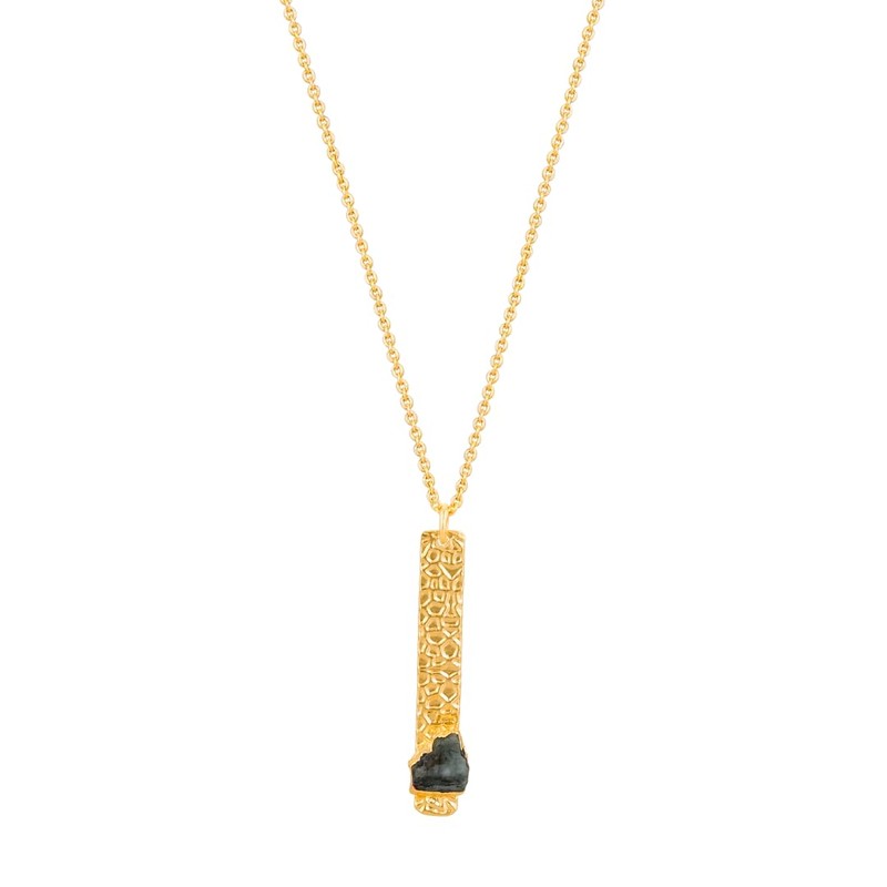 - VERTICAL HAMMER FINISH BAR Sleek hammered pendant (approx. 40x8 mm) set in radiant gold — balances earthy texture with refined design
