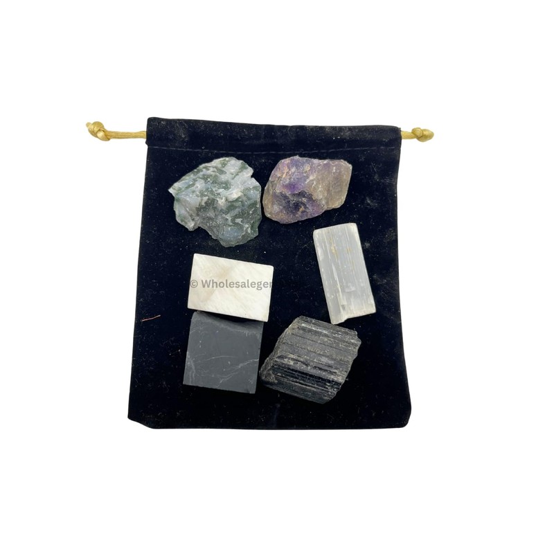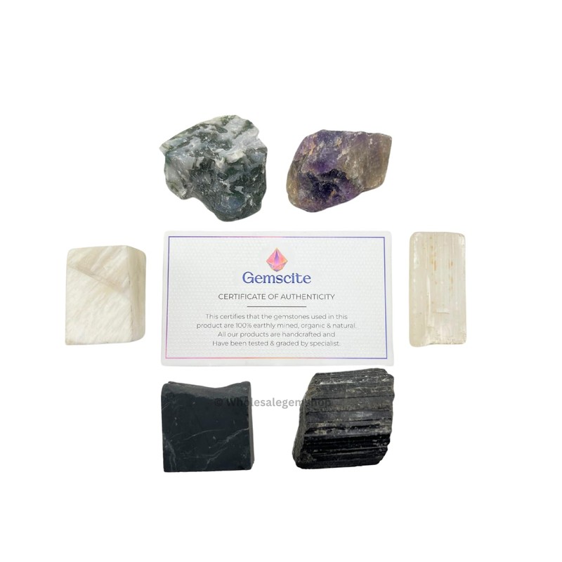 - Authentic raw healing crystals and stones includes Amethyst, Scolecite, Shungite, Black Tourmaline, Selenite and Moss Agate.
