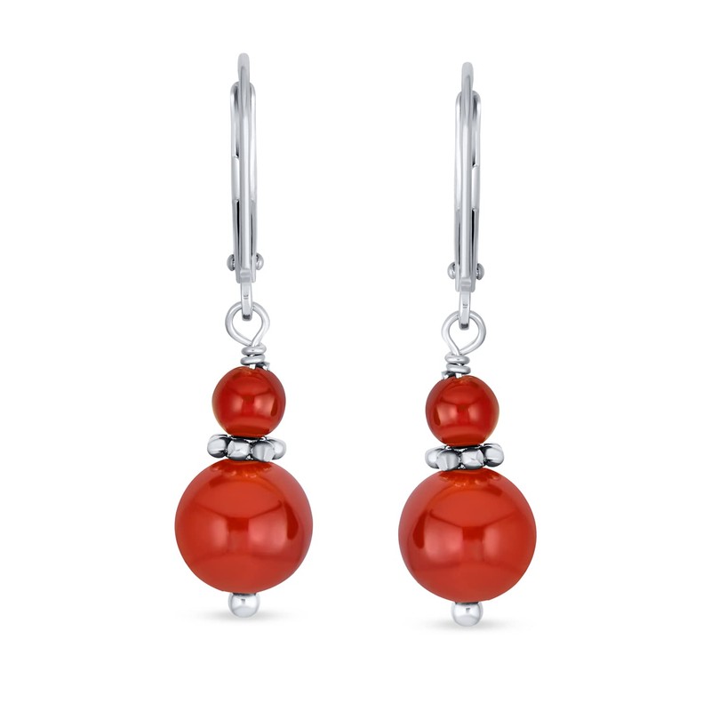 Gemstone Natural Red Carnelian Boho Bali Milgrain Edged Beaded Rondel Separator Double Ball Round Drop Dangle Earrings For Women Teen .925 Sterling Silver Lever back