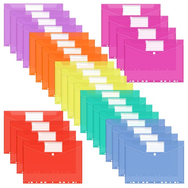 Gemtte Document Wallet A4 for Filing, Pack of 28 Document Folders, A4, 7 Colours, A4 Multicoloured Document Bag with 11 Hole Edge, Label Bag for Documents Organising