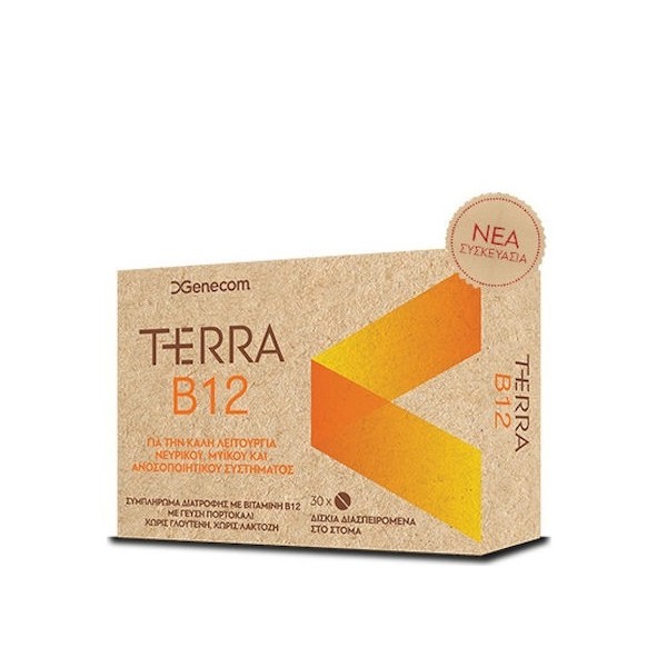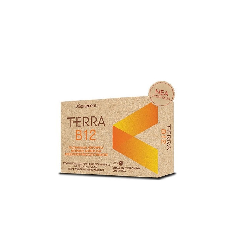 Το Genecom Terra B12 αποτελεί ένα διατροφικό συμπλήρωμα που συνδυάζει βιταμίνη Β12 και βιταμίνη C για την υγεία του νευρικού, μυϊκού και ανοσοποιητικού συστήματος.