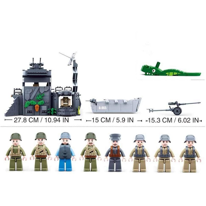 - The inside has supply storage with ammo and barrels. There is a landing craft, motorcycle, and cannon included. Set comes with 2 barbwire stands and landing craft barriers, block barriers, and palm tree. The building blocks are compatible with all major brands. Great addition to your military themed building block bricks toy collection.