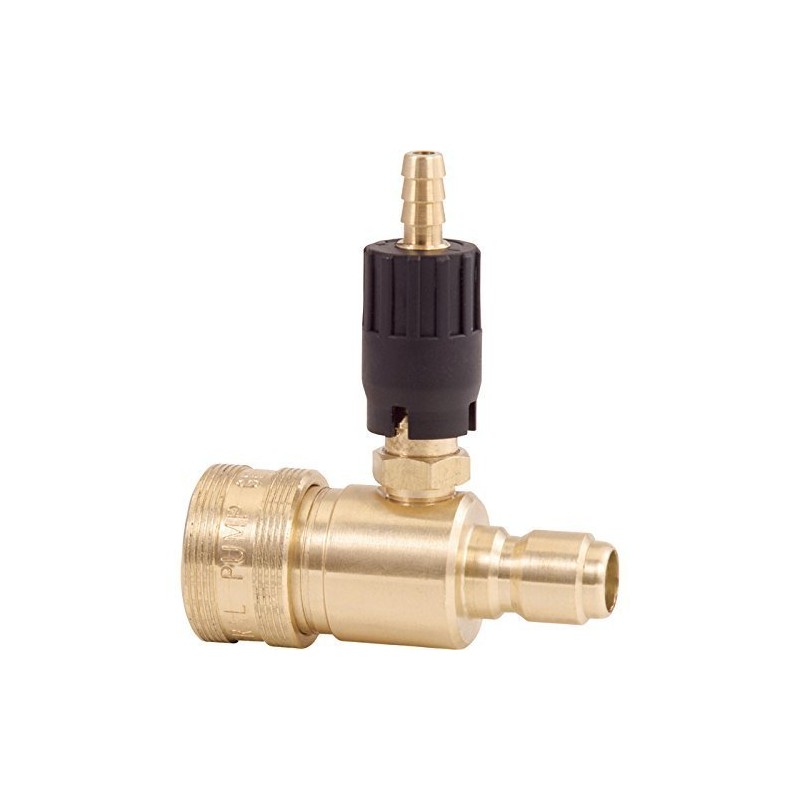 This General Pump Quick Connect Pressure Washer Detergent Injector features a hardened steel nipple for up to 3500 PSI. Female Outlet (in.): 3/8 Coupler, Max. Degree Detergent ( deg F): 190, Flow (GPM): 2.0-3.0, Max. PSI: 3,500, Orifice Size: 1.8mm, Material: Brass, Male Inlet (in.): 3/8 Plug