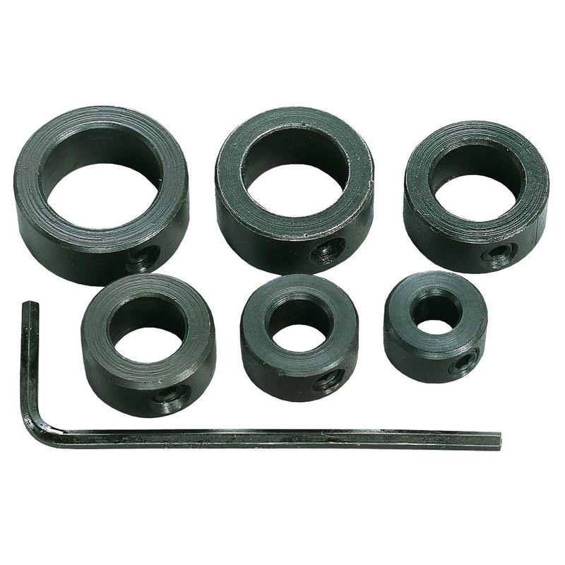 6 Piece, Drill Stop Set, For Use On Twist Or Brad Point Drills To Prevent Excessive Drill Penetration, Positive Depth Control Assures Exact Hole Depths For Multiple Drilling Jobs, Black Oxide Finish On Cold Rolled Steel, 6 Sizes From 3/16" To 1/2", Includes Hex Wrench.