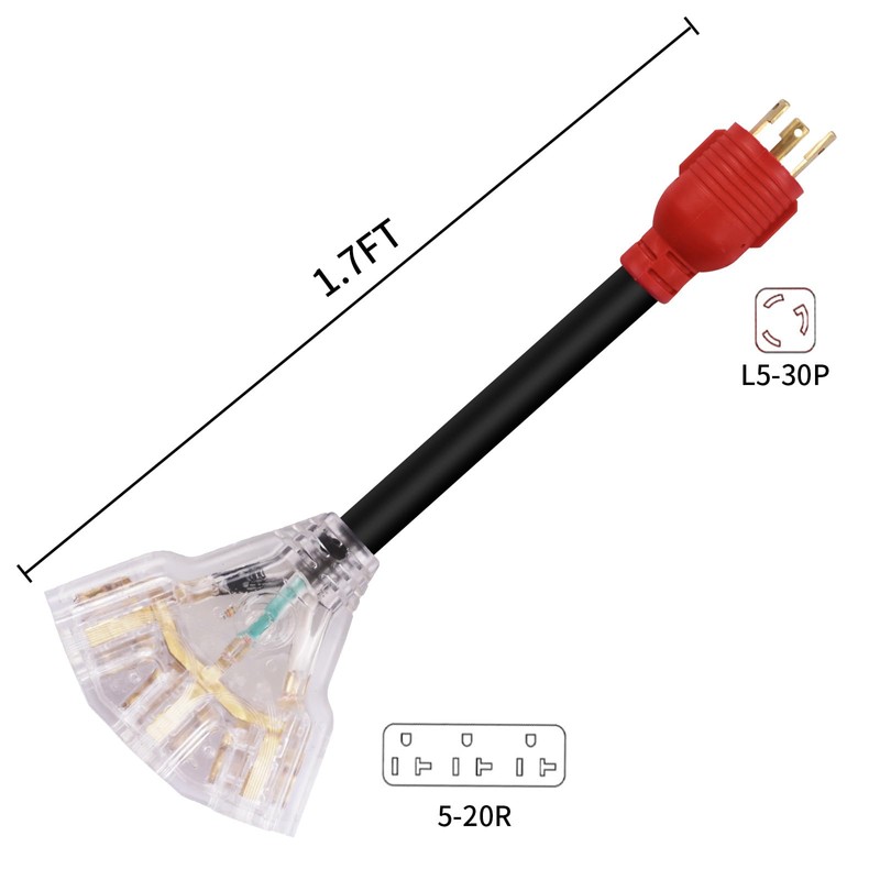 - 【SPECIFICATION】1.7FT Nema L5-30P Male to 5-15R/20R Female Generator RV Adapter Cord maximum 30 Amp overload capacity, rated for 125V, max rate 3750 Watts. with UL certification. 30 amp to 110 adapter suitable for RV, camping, various construction sites, great for emergency power for lighting or projects maintenance