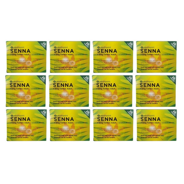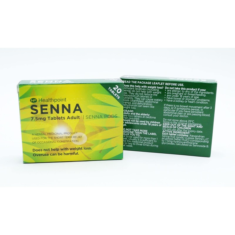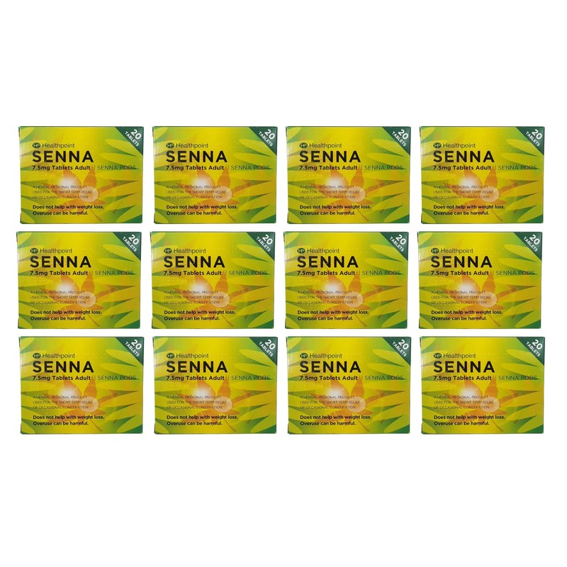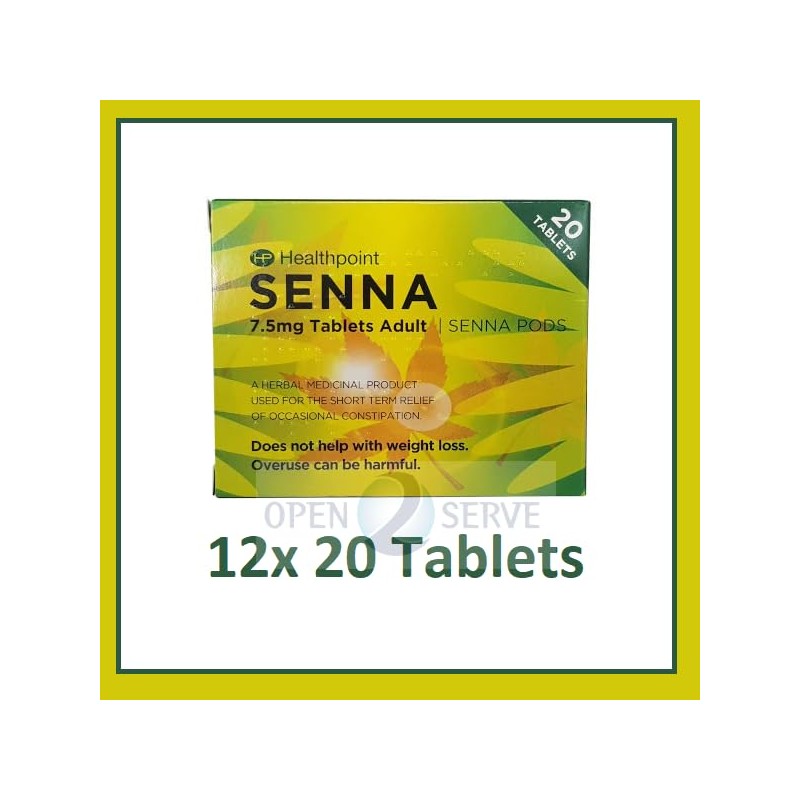 Product descriptionHealth Point Senna Pods Tablets are your reliable solution for gentle, effective relief from occasional constipation. Each pack contains 20 tablets made from natural Senna extract, known for its mild laxative properties that support healthy bowel movements. This bulk package includes 12 packs, providing a total of 240 tablets to ensure you have long-lasting relief on hand. Ingredients ACTIVE INGREDIENT:Each tablet contains: Alexandrian Senna fruit (pods) (Cassia Senna L,(C. acutifolia Delile) fruit) corresponding to 7.5mg hydroxyanthracene glycosides, caluculated as Sennoside B. Usage Directions: For adults and children over 12 years: Take 1-2 tablets before bedtime with water. Do not exceed the recommended dosage. Consult a healthcare professional before use if you are pregnant, breastfeeding, or have a medical condition. Storage Instructions: Store in a cool, dry place, away from direct sunlight. Keep out of reach of children. Warnings: Not recommended for long-term use. Prolonged use may lead to dependency. If symptoms persist, consult your doctor.IngredientsACTIVE INGREDIENT:Each tablet contains: Alexandrian Senna fruit (pods) (Cassia Senna L,(C. acutifolia Delile) fruit) corresponding to 7.5mg hydroxyanthracene glycosides, caluculated as Sennoside B.Safety WarningSafety Warning Overuse can be harmful. DO NOT TAKE MORE MEDICINE THAN THE LABEL TELLS YOU TO. Not to be used for more than 1 week. Usually it is sufficient to take this medicinal product up to two to three times during that week. Do not take this product if you: - are allergic to any of the ingredients. - are pregnant or breastfeeding. - are under 18 years of age. - have bowel or stomach problems. - have a kidney or heart condition. If there is no bowel movement after 3 days, or if symptoms persist, in particular if you have persistent abdominal pain or are passing blood, consult your doctor. KEEP OUT OF THE SIGHT AND REACH OF CHILDREN Do not use after the expiry date. Ingredients ACTIVE INGREDIENT:Each tablet contains: Alexandrian Senna fruit (pods) (Cassia Senna L,(C. acutifolia Delile) fruit) corresponding to 7.5mg hydroxyanthracene glycosides, caluculated as Sennoside B.