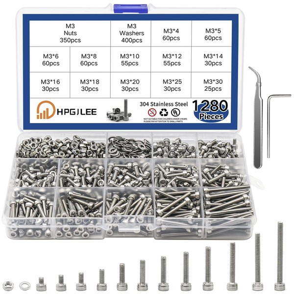 Generic 1280pcs M3 Screws Metric Stainless Steel 304 Hex Socket Head Cap Screws Bolts Nuts Washers Assortment Kit