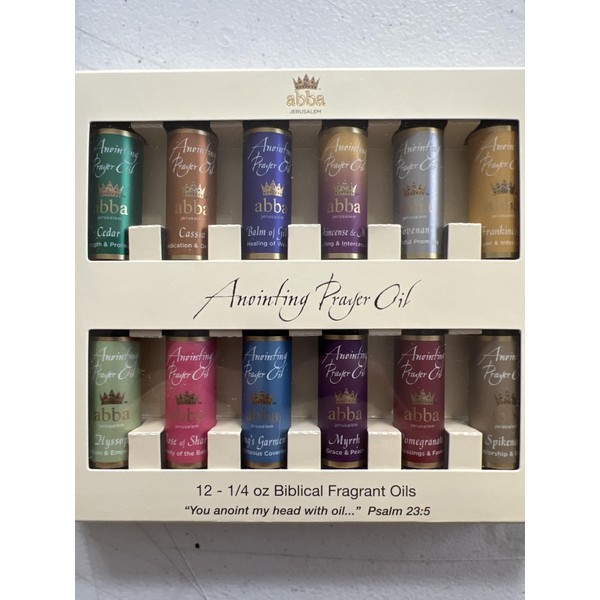 - 12 VARIETY - 1/4 oz ANOINTING OILS - NOW AVAILABLE IN NEW PACKAGING! Our custom designed gold box with view window contains a 1/4 oz. bottle of each of our 12 fragrances: Balm of Gilead, Cassia, Cedars of Lebanon, Covenant, Frankincense, Frankincense & Myrrh, Hyssop, King's Garments, Myrrh, Pomegranate, Rose of Sharon and Spikenard.