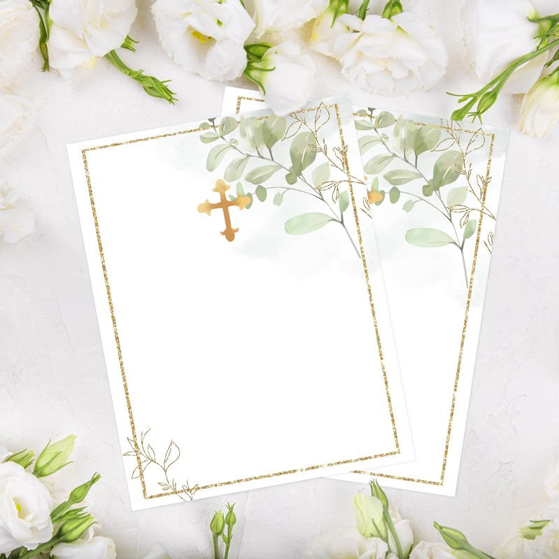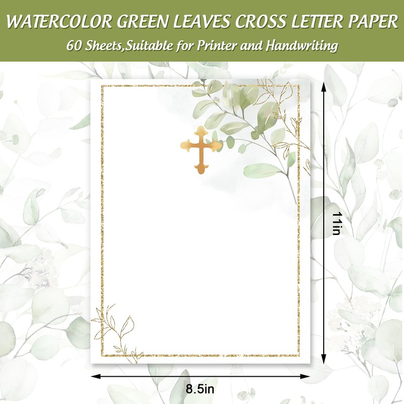 60 sheets letter paper designed with watercolor green leaves and gold cross, sufficient to give to your family members and friends.