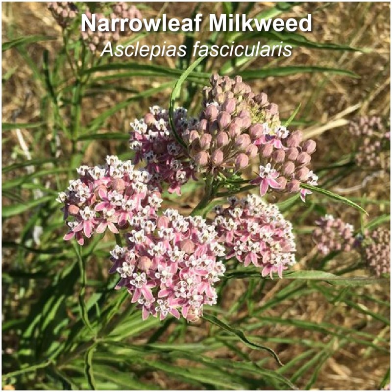 • FIRST NATIVE Narrowleaf Milkweed (Asclepias fascicularis): Perennial in USDA Zones 6-10. Drought tolerant; needs good drainage. Plant height from 24 to 36 inches (61-91cm). Blooms June to September. Likes full sun. Deer resistant. Seed count: 12+