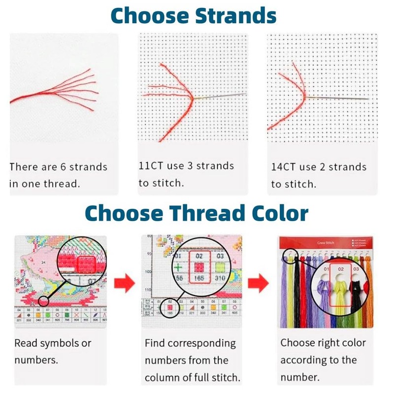 2. 11CT requires 3 strands of thread to complete the embroidery Each line we provide consists of 6 strands,so you will need to divide the 6 strands into 2 strands before working.