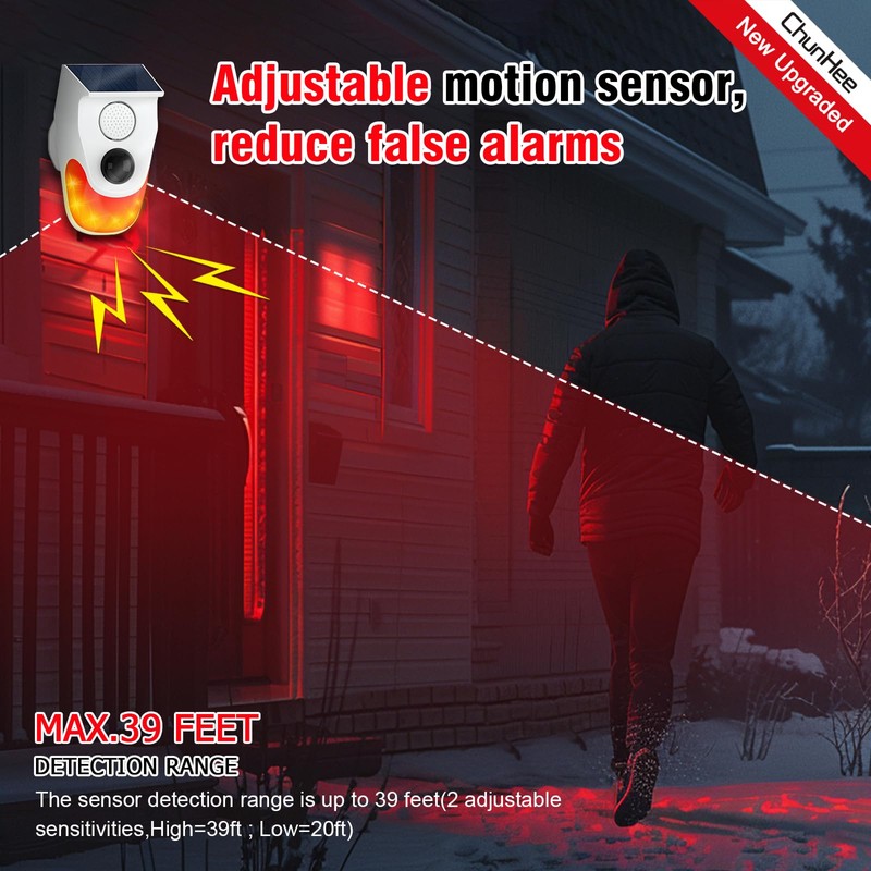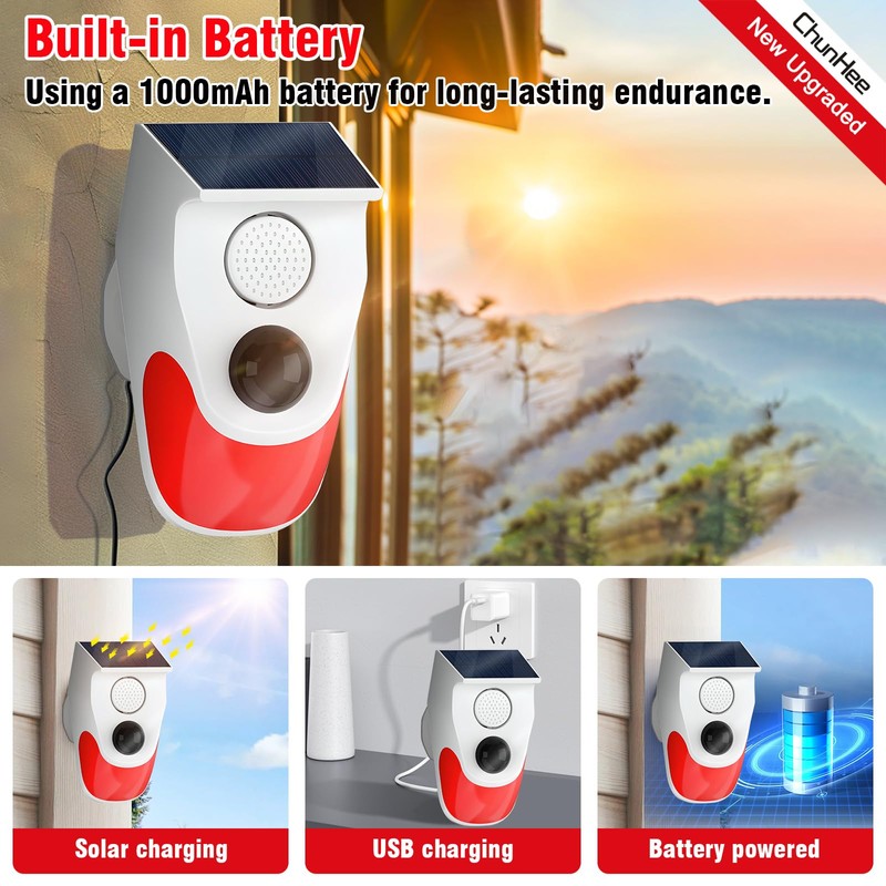 - Motion Sensor Alarm Outdoor:Are y tired of rodent animals invading destroying your home and garden?The solar alarm motion detector detection angle is 110°,the ourdoor alarm inchude 3 working modes to choose,can drive animals out of your home,24 hour guarding for your home and property