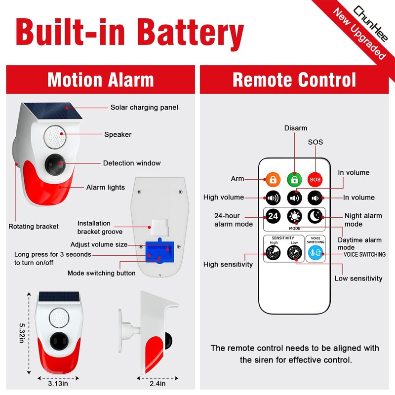 - Solar-Powered:The motion sensor alarm equipped with solar panels and rechargeable batteries, it can absorb sunlight, work longer, no need to replace the battery, save energy and save electricity