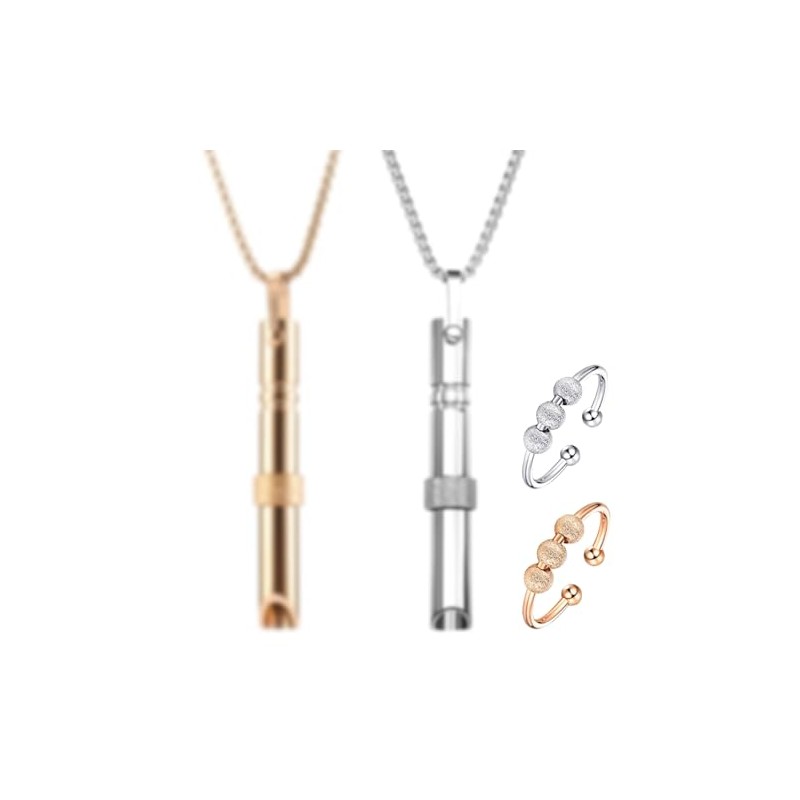 Product DescriptionBreathing Necklace, Anxiety Necklace, Stress Relief Necklaces, Anxiety Relief Necklace, Anxiety Necklace Breathing, Whistle Necklace for Anxiety Relief MeditationSpecificationColor: Silver and Rose Gold Products: Breathing Necklaces, Anxiety Rings1. The dimension of the breathing necklace is about 23.62 inches/ 60 cm in total length, 1.97 inches/ 5 cm in pendent length, this allows the breathing necklace to hang snugly around the neck without being too tight or too loose. Anxiety rings are adjustable.2. Breathing necklace can provide calming and stress-relieving effects, making it an excellent tool for alleviating anxiety and stress. Regularly practicing deep breathing is beneficial for both the mind and body, promoting relaxation.3. You just need to take a deep breath with your nose for about 4 seconds, stay in the abdominal cavity for about 7 seconds, and then gently exhale through the necklace for 8-10 seconds to release all the air. Relax your jaw and your shoulders.Package Including2 x Breathing Necklaces 2 x Anxiety Rings