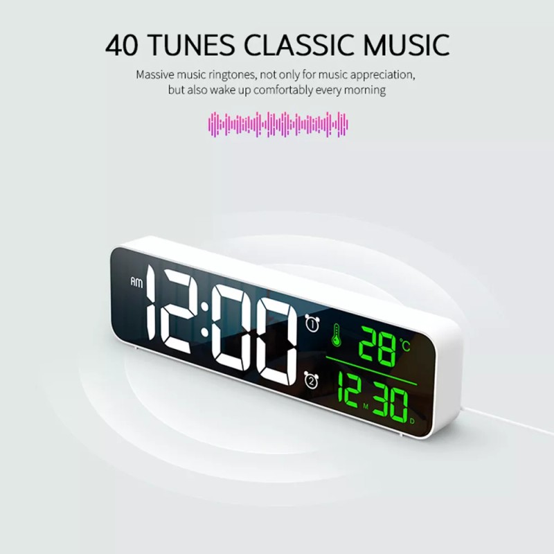 Despertador digital LED para dormitorio, reloj electrónico con termómetro, 2 alarmas, 5 niveles de brillo, 40 campanas, música, montaje en pared, espejo, carga USB para mesita de noche y oficina