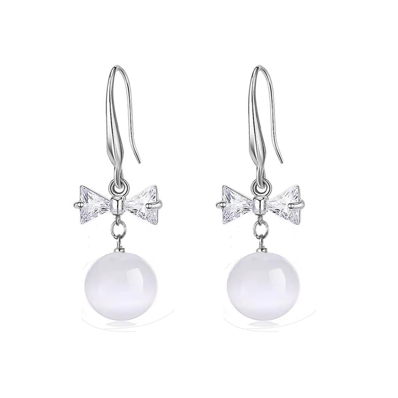 Generic Elegant Sterling Silver Cubic Zirconia Bow and Faux White Cat-Eye Opal Drop Earrings - Hypoallergenic Fashion Jewelry for Women (Round)