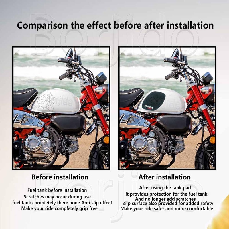 - Monkey125 Motorcycle fuel tank pads are weatherproof and corrosion-resistant. It is resistant to all adverse weather conditions and is highly resistant to water and sunlight. It can be used for a long time