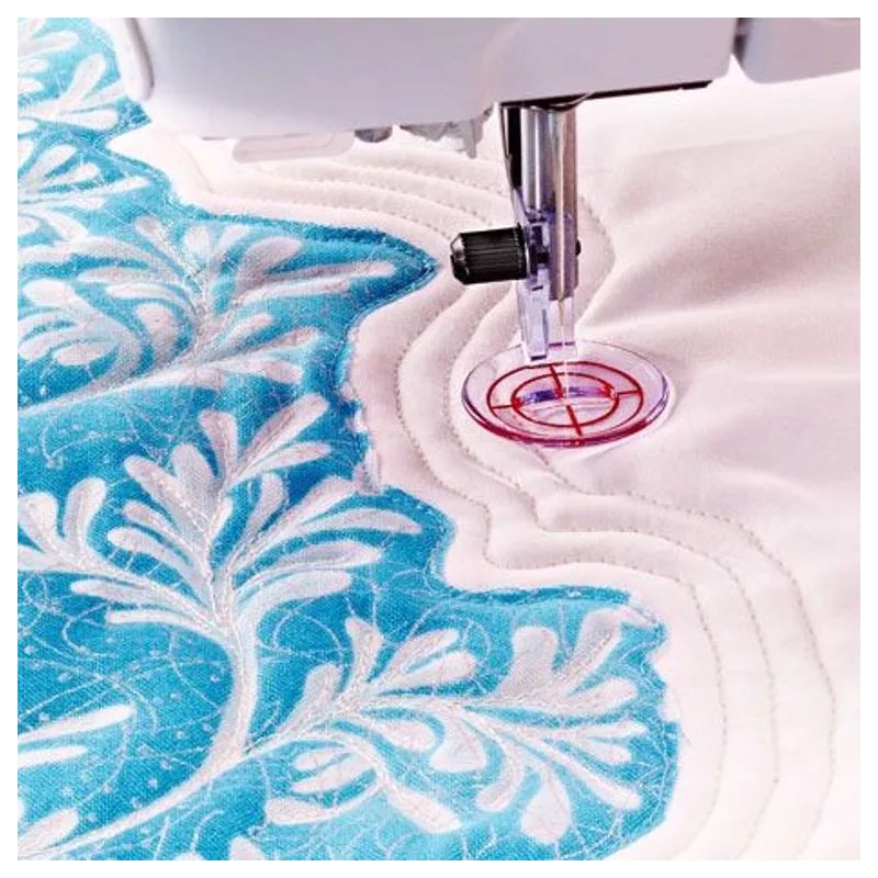 The Free-motion Echo Quilting foot is designed to give you more control when free-motion quilting. The large base ensures good surface contact with the fabric and provides better control of the stitching. The transparent base allows for 360 degree visibility. Vertical, horizontal and circular markings on the foot make it easy to follow a continuous line quilting pattern or design on the fabric. Sew straight lines or follow patterns with rounded edges in any direction.