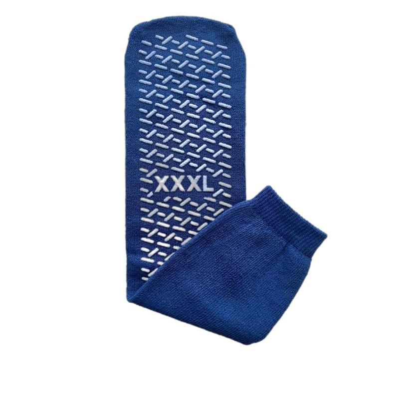 DescriptionExpect three pairs of 3XL (XXXL) blue slip stop socksThese are non-skid socks with a single imprint that come in a brand-new, factory-sealed bag, guaranteeing quality and hygieneThese socks are made of premium materials and have a special combination that guarantees flexibility and durability. Extra grip is provided by the inbuilt slip-resistant thread, which lowers the possibility of slips.