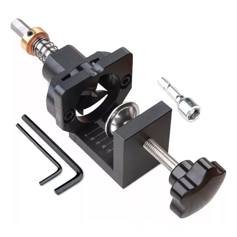 Las básculas de medición de precisión ofrecen una alineación precisa y repetible de las bisagras: la profundidad de la copa se puede ajustar hasta 1 pulgada (25 mm) y la distancia entre los bordes se puede ajustar de 3 mm a 6 mm.