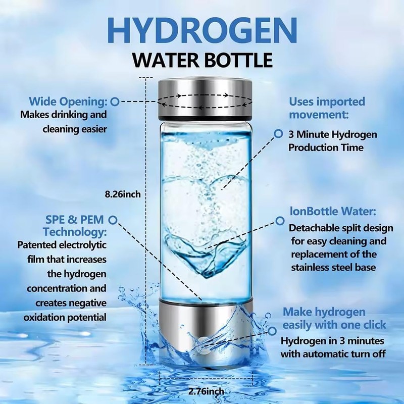 - Levate your hydration routine in just 3 minutes! Experience the convenience of on-the-go wellness without compromising on the quality of your hydration. Hydrogen Water Bottle uses SPE PEM technology to quickly generate up to 1200ppb (1.2ppm) of hydrogen ions in a single cycle, ensuring that every sip is infused with the goodness of molecular hydrogen.