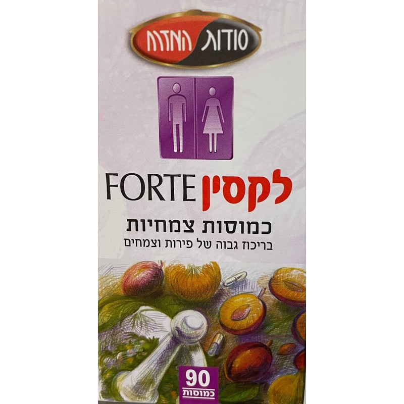 Laxin Forte capsules are an ideal, natural, safe solution for those suffering from constipation. Laxin Forte's benefits: All-natural ingredients Contains a high concentration of fruit juices and unique herbs Particularly effective No side-effects No preservatives or food coloring Ingredients: Rheum Extract 5:1, Psyllium Plantain (Plantago Afra), Prunes Extract 10:1, Fennel (Foeniculum Vulgare), Tamarind Extract 4:1 (Tamarindus Indica), Fig Extract 4:1, HPMC Capsule. Directions: 1-3 capsules (as needed) in the evening, with or after dinner. Contents: 90 capsules Made in Israel. Kosher Pareve under the Rabbinical Supervision of Badatz Beit Yosef and Rabbanut Holon. Disclaimer: For adults only. Pregnant women, nursing mothers, and individuals taking prescription drugs should consult a healthcare professional before use. This information is not intended as medical advice and should not be considered as such. If you have a medical condition or any concerns, please seek guidance from your doctor.
