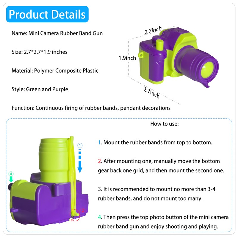 - Compact Size: With dimensions of 2.7 x 2.7 x 1.9 inches, the Mini Camera Rubber Band Gun is portable and easy to carry. Take it anywhere and surprise your friends with impromptu rubber band battles!
