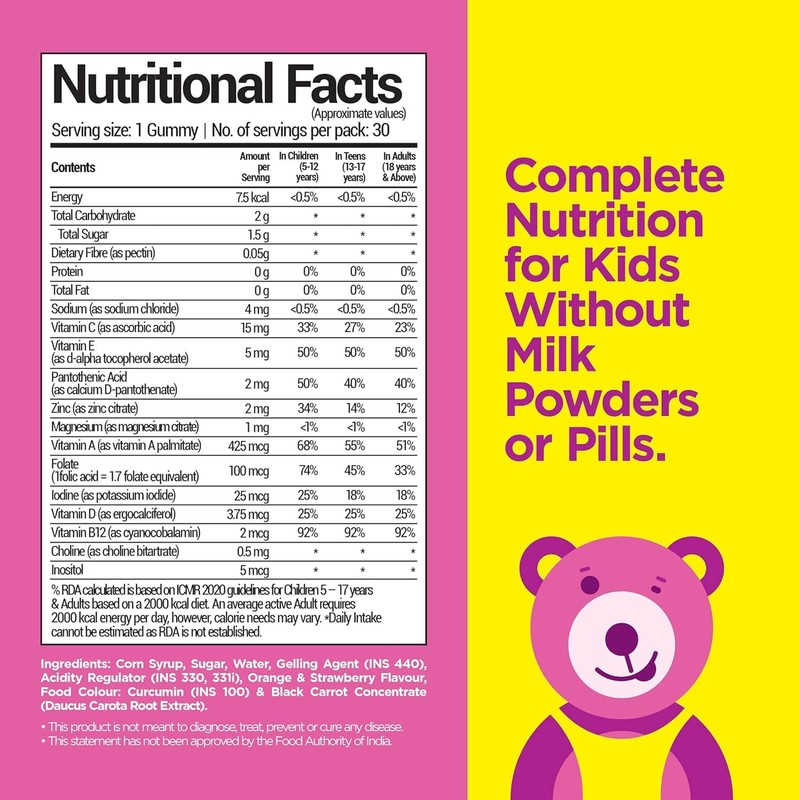 - WELL-BALANCED NUTRITION C Our vitamin gummies for kids aged 2 to 12 years are packed with 12 essential vitamins including A, B, C, and D. They also contain choline, zinc, and magnesium to support physical development and year-round immune defense.