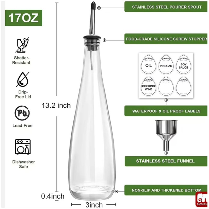 - Introducing a Modern Kitchen Essential: Simplistic Cooking Oil Dispenser Set. This Kit Features Two Premium (500ml) Glass Bottles, Complete with Two metal pourers, a Convenient Funnel, and a Set of 6 Labels.