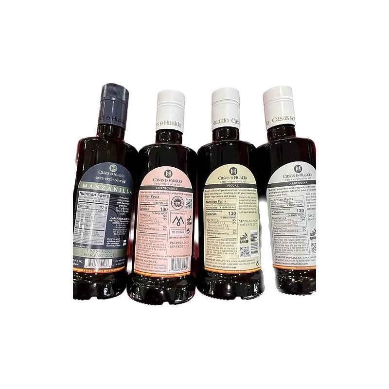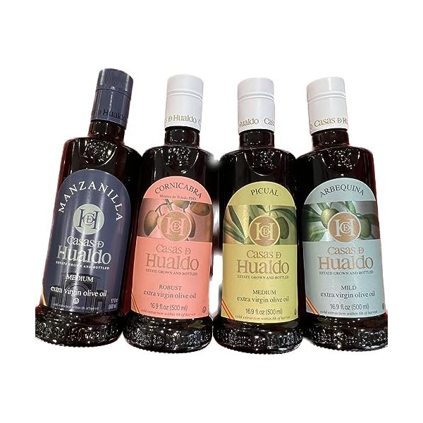 Generic Pack 4 Arbequina, Picual, Cornicabra, Manzanilla Extra Virgin Olive Oil CASAS DE HUALDO 500ml (Aceite de Oliva Arbequina, Picual, Cornicabra, Manzanilla)