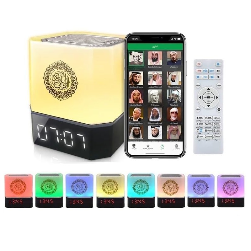 Quran Speaker,Night Lights,Bluetooth Speaker,Multi-Color Changing Bedside Lamp Alarm Clock,with Remote & APP Contro Full Recitations of Famous Imams and Quran Translation in Many Languages