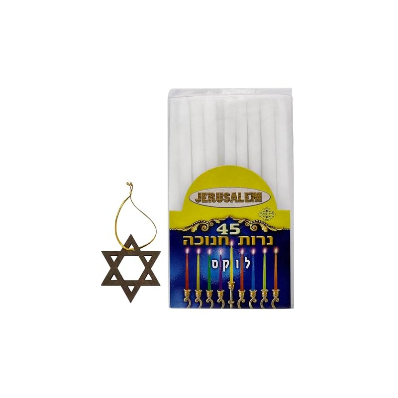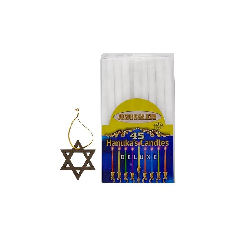 Generic White Chanukah Menorah Candles 45 Candles per Box Kosher Made in Israel Includes One 2"" Wooden Star of David