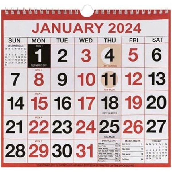 - Includes UK moon phases, week numbering and UK and ROI holidays