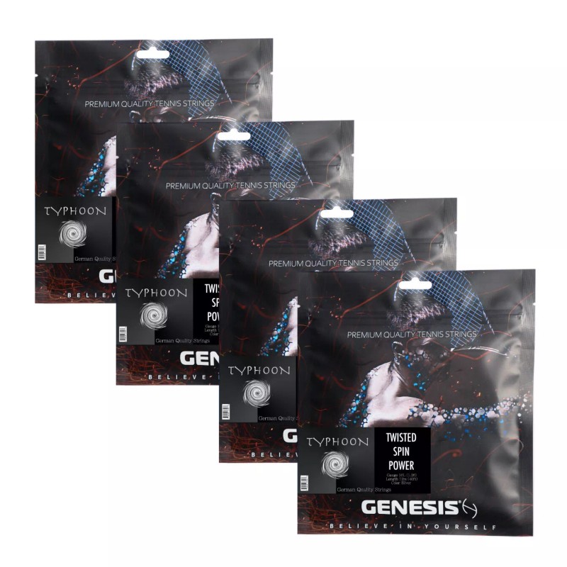 TYPHOON delivers outstanding spin along with pinpoint accuracy and unrivaled tension maintenance. Utilizing the most innovative and cutting edge technology, GENESIS has created a string that excels in every category. GENESIS TYPHOON is made from a proprietary composite formula of high-tech polyester resin combined with new performance enhancing chemical additives. Extruded with a pentagonal profile, TYPHOON is then additionally twisted axially for maximum bite and control. The poly ether material together with aluminum fibres offers players the best in feel and power. An extra coating of teflon increases the liveliness and offers a nice crisp stringbed. The specially formulated additives reduce string movement and provide long lasting tension maintenance.