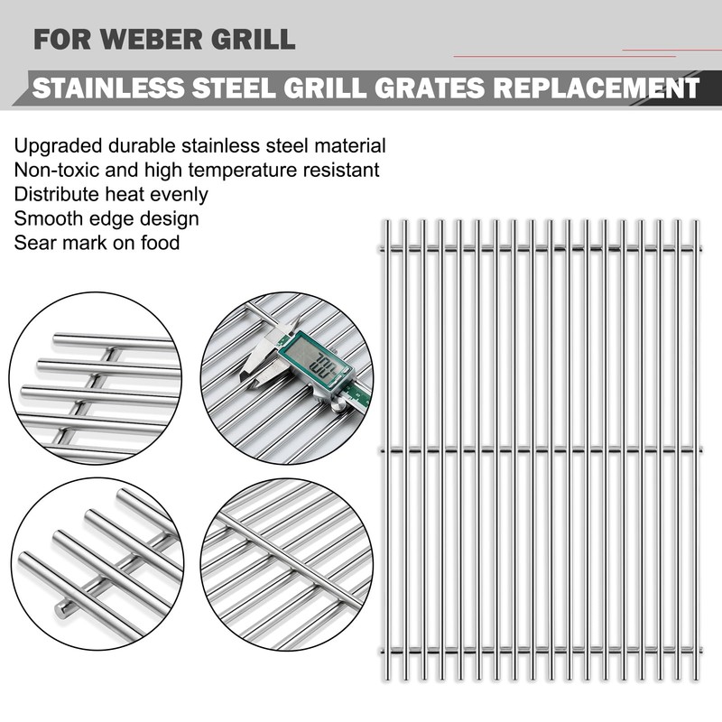 - 【WEBER GENESIS II GRILL GRATES DISTRIBUTE HEAT EVENLY AND QUICKLY】Made by thicken stainless steel material, our genesis ii grill grates distribute heat evenly and heats up more quickly. The weber genesis 2 grill grates also good at retains heat. With smooth edge design, which is more safety. You can add the beautiful sear marks on your food with the grid line on the replacement grates.