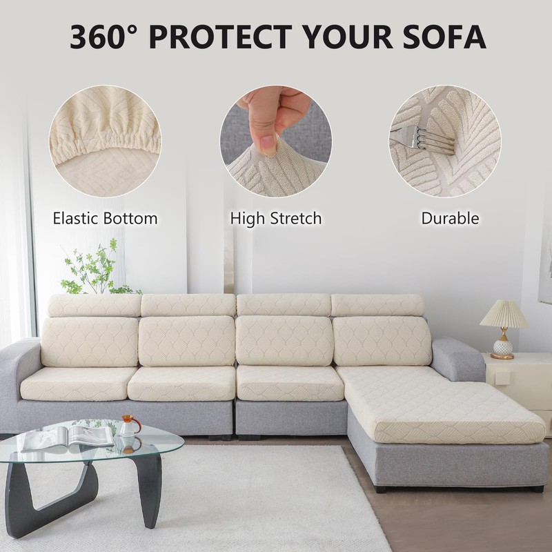 Genina 100% Waterproof Couch Cushion Covers for Pets - L Shape Chaise Lounge Cover Stretch Seat Chaise Couch Cover Jacquard Non Slip Sectional Couch Covers Sofa Slipcovers Washable (1 Piece, Ivory)