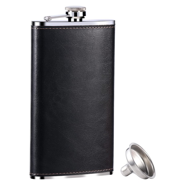 GENNISSY 12 OZ Hip Flask - Classic Silver Stainless Steel Flasks for Liquor with Funnel (12OZ Black Leather)