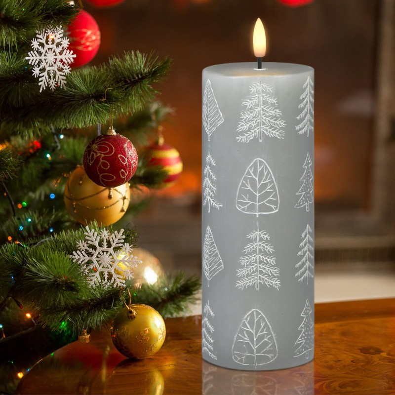 - GenSwin Carved Christmas Tree Candle Flameless Candle with 6h Timer, Gery LED Pillar Candle with 3D Flame, Real Wax LED Battery Operated Candle Light for Home Décor Centerpieces (3" x 9")