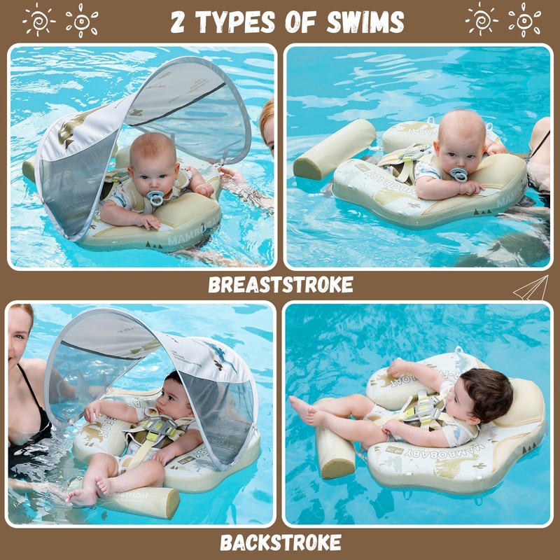 GENTEACO Mambobaby Baby Pool Float with Removable Canopy 3-24 Months Baby Float Soft Waterproof Infant Swim Float Add Tail Avoid Flip Skin-Friendly Material Swim Trainer for Toddler Boys Girls (Beige)
